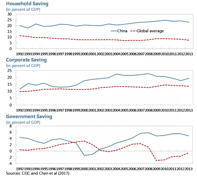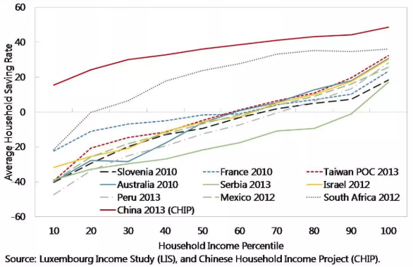IMF在一篇工作论文中指出,人口结构变化、收入不平等加剧、社会保障体系转型以及住房市场的发展均是中国家庭高储蓄的主要因素。值得注意的是,和其他国家相比,中国家庭储蓄率在每个收入十分位数都较高,并且最低收入阶层储蓄率也高达20%左右,这部分说明了中国社会转移不足,税收缺乏累进性,社会保障网络有限等。