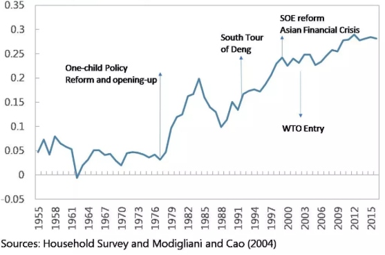20世纪70年代后,中国家庭储蓄出现了三个增长阶段(见图3)。第一个阶段是80年代引入独生子女政策后,第二个阶段是90年代改革开放后,中国从计划经济向市场经济转型期间,社会安全网和就业保障的转变是储蓄增加的主要原因,在此期间,家庭储蓄率上升至25%。第三个阶段是2001年中国加入WTO后,储蓄率进一步上升至30%。