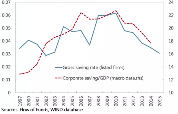 图5 中国企业储蓄(占GDP比重,及占总资产比重)
