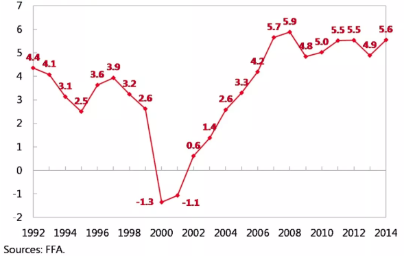 中国的企业储蓄在21世纪初飙升,部分原因是汇率被低估。 全球金融危机以后,企业储蓄量下降,而中国的汇率逐渐调整到符合经济基本面的水平(见图5)。 在过去十年中,由于高速投资,中国的净储蓄率(总储蓄减去投资与资产的比率)为负,所以企业部门并不是中国经常账户盈余的推动因素。中国的情况与其他一些东亚国家形成鲜明对比,那些国家的企业净储蓄值为正且数值较大,这或许是他们外部失衡的主要原因。