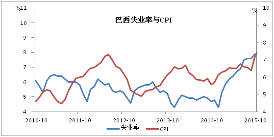 巴西10月份的失业率高达7.9%,创下五年以来的最高值。巴西今年已经连续三个GDP出现萎缩。在2014年,经济增长只有0.1%,通胀却高达6.41%。巴西地理统计局(IBGE)11月中公布的数据显示该国今年物价同比涨幅已经超过10%,而名义工资水平却几乎毫无变化。现在失业率飙升成为了该国经济开启衰退模式的另一个佐证。