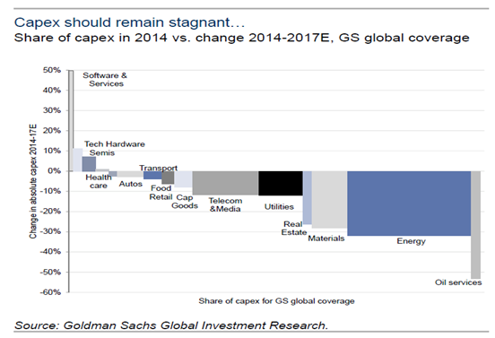 图一:2014年高盛全球覆盖资本支出份额及2014-2017年资本支出变化
