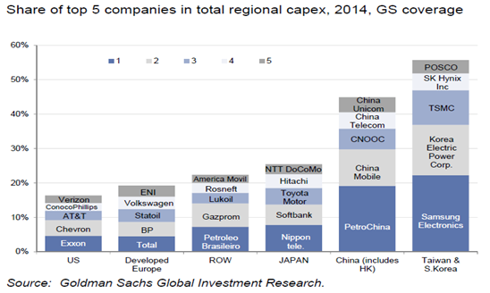 世界上资本支出最多的公司普遍都是石油、电信和制造行业巨头,中国也不例外,只是集中度更高。中国2014年资本支出最多的五大公司(中石油、中国移动、中海油、中国电信、中国联通)占全国(包含香港地区)总资本支出的45%左右,该比例远高于美国和欧洲发达国家的不足20%。