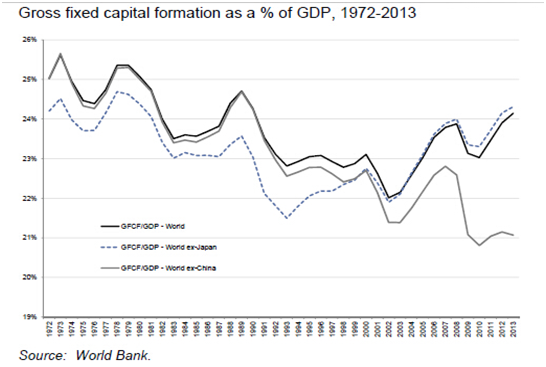 2013年全球固定资本形成总额占GDP比重略高过24%,但如果扣除掉中国,其比重将会跌至21%下方,这反映出两个现象:第一是中国经济全球影响力巨大,第二也是更重要的是中国固定资本形成总额对GDP的影响要比其他国家大的多。