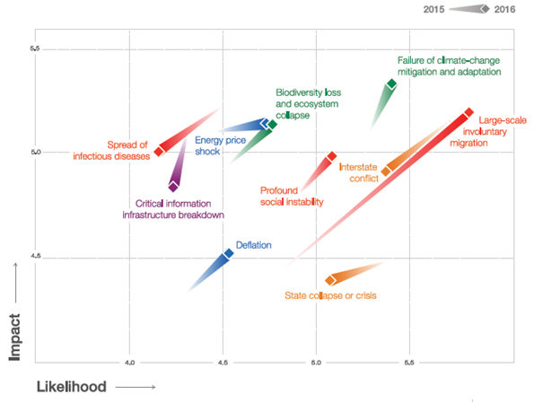 世界经济论坛(World Economic Forum)《2016年全球风险报告》认为,与2015年相比,全球各种风险的发生概率都在上升。短期内来看,影响最大的风险是无法缓解气候变化及应对措施不力,而最受关注的风险是大规模的非自愿移民。从长期来看,水资源危机是困扰全球最大的问题。而在商业领域,失业与非充分就业是短期关注的焦点。