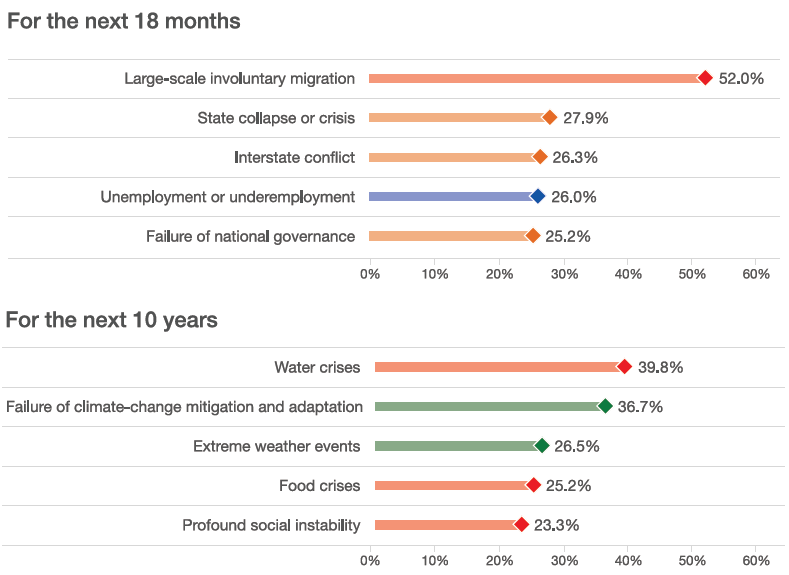52%的受访者认为大规模的非自愿移民是未来十八个月最值得关注的全球风险,紧随其后的是国家崩溃(风险)、地域冲突、失业与非充分就业等。不过对于未来十年,最大的风险则来自于水资源危机以及在气候变化方面的挑战及政策失误。社会稳定是全球恢复元气的关键,其中最重要三点是:公民权利保障、应对气候变化并保障粮食安全和防止全球疾病爆发。