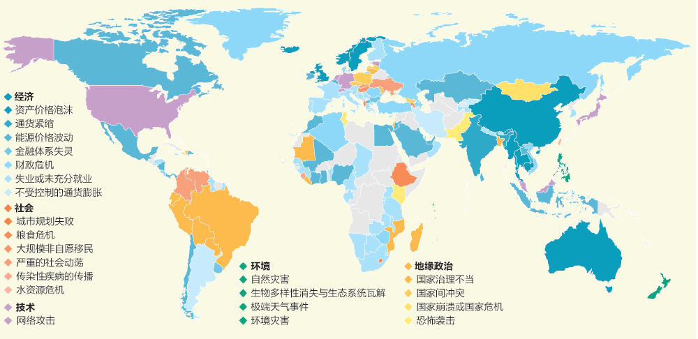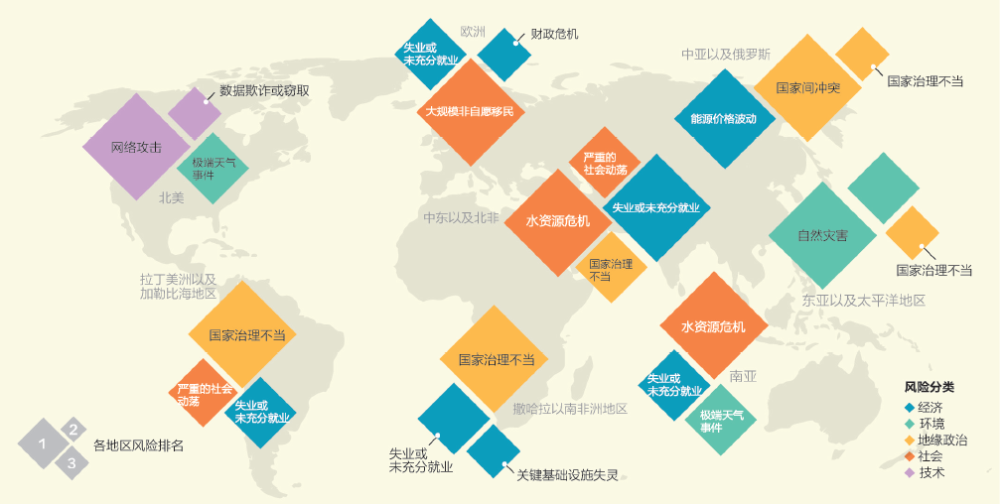 在全球范围内,失业与未充分就业被认为是商业经营领域最值得关注的风险。但各地区有着自己独特的风险点:欧洲主要面临财政危机、失业、资产价格泡沫以及能源价格等风险;在北美地区,加拿大最关注能源价格波动,而美国则最关注网络攻击及其他网络相关风险;在中亚地区及俄罗斯,最被关注的是财政危机、失业以及不可控的通胀等经济风险和地区间冲突;在东亚和太平洋地区,除了能源价格波动、资产价格泡沫以及网络攻击,最受关注的是环境风险;南亚地区的能源价格波动、财政危机、失业、国家治理不当是关注重点;拉丁美洲和加勒比地区最关心国家治理不当、能源价格波动和失业;中东和北非担心能源价格波动、失业、恐怖袭击和地区间冲突;在撒哈拉以南非洲,最关心失业、能源价格、国家治理不当和主要基础设施缺失。