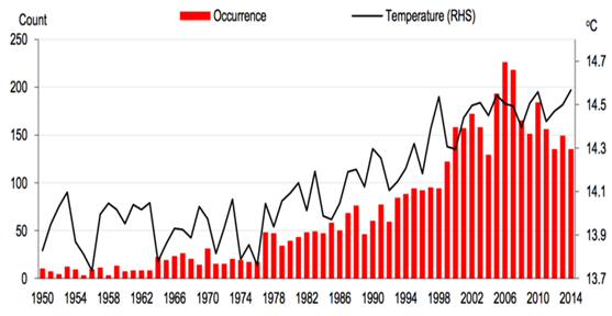 图2 洪水的发生次数与全球平均气温