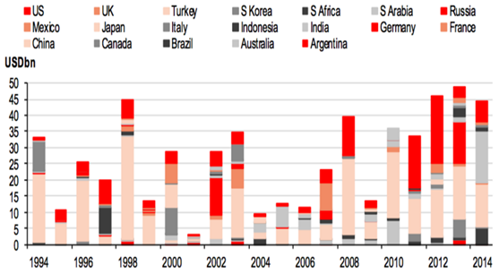 尽管如此,重大自然灾害造成的损失却对经济影响显著。根据HSBC估计,2005-2014年来G20国家仅因天气灾害造成的损失就达到3090亿美元,其中损失的39%来自于中国,美国与印度则分别为总损失贡献了22%和11%。