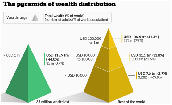进一步细分人群,可以得出0.7%的世界人口掌握了世界44%的财富而最底层69.8%的人只拥有世界财富的2.9%。