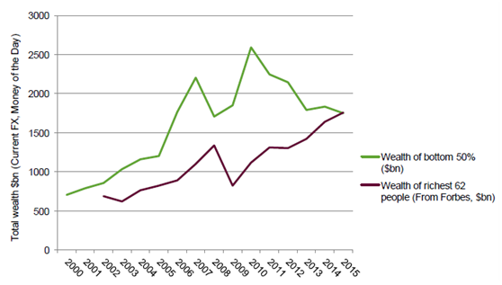金融危机之后,世界的贫富差距进一步扩大。2014年的结果显示世界最富的80人与全球50%最贫穷人口所持财富价值相当。然而到2015年,富豪人数仅需62人就可持平。