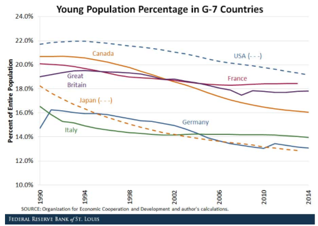 图2 G7国家的低龄人口占比不断下降