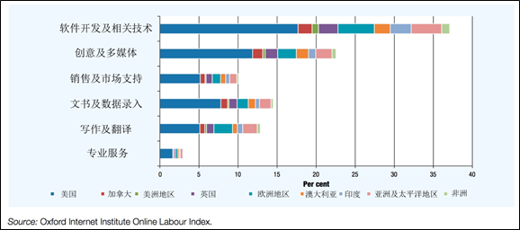 近日,联合国贸易和发展会议在日内瓦发布《2017数字化、贸易与发展报告》。报告显示,在全球范围内,数字平台的崛起为劳动力市场注入了新的活力。2016年,在线外包平台的市场规模已超过40亿美元,且以每年25%的速度增长。在各类在线外包工作中,软件开发及相关技术目前占据首位(图1)。而随着技术发展,外包工作的种类仍将继续扩张。