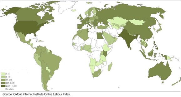 另一方面,在线外包工作的提供者多集中于美国、印度、澳大利亚、英国及加拿大等互联网基础设施更加完备的国家(图2)。与之相反,求职者并不受所处国家的限制,呈现出更加分散的状态(图3)。比方说,美国求职者所要面对的竞争者不仅来自本国,还包括印度、菲律宾等低收入国家。这一定程度上将影响求职者的议价能力。