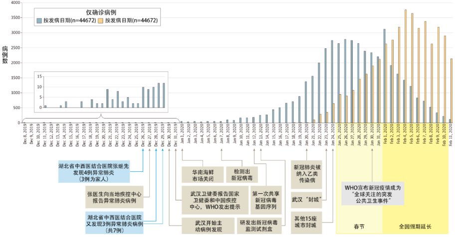 在新冠疫情确诊病例流行病曲线中,每日确诊病例数按出现症状日期(蓝色)和诊断日期(橙色)绘制,它们之间的差异说明发病时间与用病毒核酸检测确诊之间存在延迟,这也是早期医疗资源不足所致。自2019年12月27日初步明确病毒特性后,就开始实行了一些措施,直到后来相继出台了更为严厉的人员流动与接触控制措施。