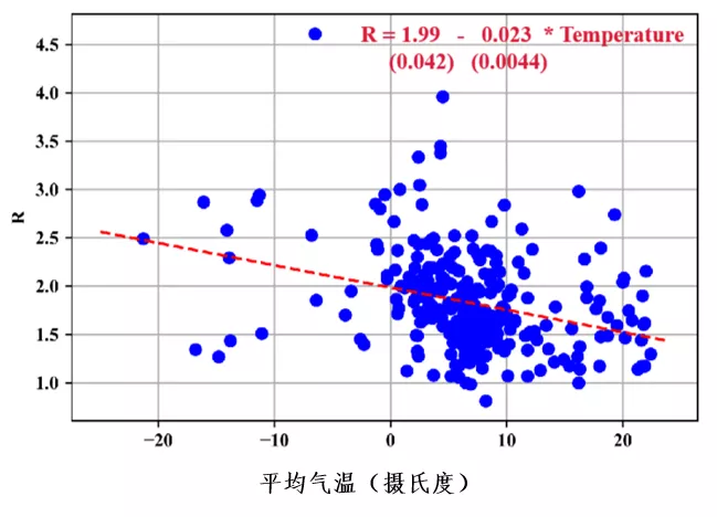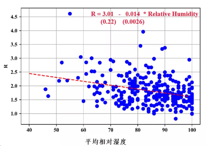 图3 100个中国城市新冠病毒传染数R与温度-湿度的关系