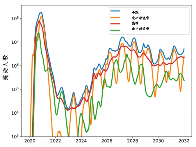 相反,巴塞尔大学和卡罗林斯卡学院研究团队认为,新冠病毒在春夏两季传播减缓可能造成疫情得到有效抑制的错觉,随后在秋冬卷土重来,发生类似1918年大流感的多次全球爆发。并且新加坡的病例表明病毒传播可能不仅限于冬季,在温暖的夏天仍然能够传播。如果患者痊愈一段时间后可能被重新感染(类似流感),那么数年后新冠病毒将会发展为季节性传染病。其每年感染人数会大大低于今年的初次爆发,但仍在百万数量级(图4)。