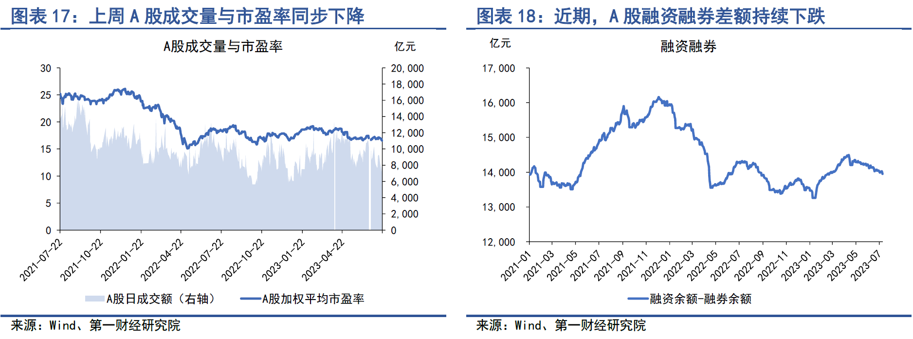 上周,A股成交量和市盈率同步下降。从成交量来看,上周A股日均成交量大幅下降11.9%至7583亿元;从市盈率来看,上周A股加权平均市盈率下降1.3%至16.8。A股融资与融券的差额下降至1.4万亿元以下。