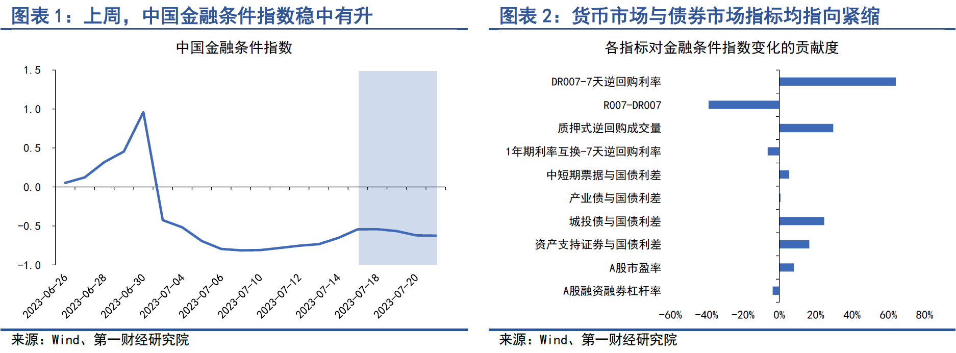 在7月17日至7月21日的当周,第一财经研究院中国金融条件日度指数均值为-0.58,较前一周上升0.17,年内指数下降0.55。
