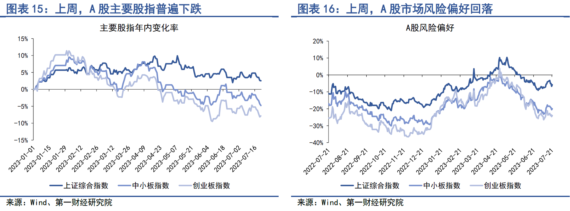 在A股主要股指中,上周上证综指下跌2.2%,中小板指下跌3.2%,创业板指下跌2.8%;年内,上证综指累计上涨2.5,中小板指下跌4.8%,创业板指下跌7.8%。上周,以股指同比增速减去10年期国债收益率所衡量的市场风险偏好有所回落。