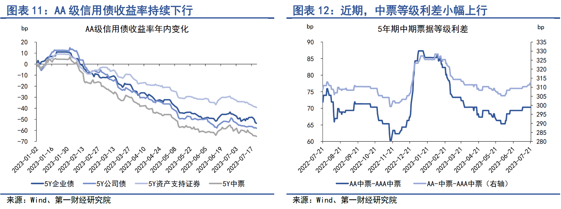 上周,信用债收益率同样全线下降。具体来看,在AAA级债券中,5年期企业债、公司债、资产支持证券以及中票收益率分别下降1.93bp、0.94bp、3.01bp以及3.66bp;在AA级债券中,5年期企业债、公司债、资产支持证券以及中票收益率分别下降0.93bp、0.91bp、3.39bp和3.66bp。