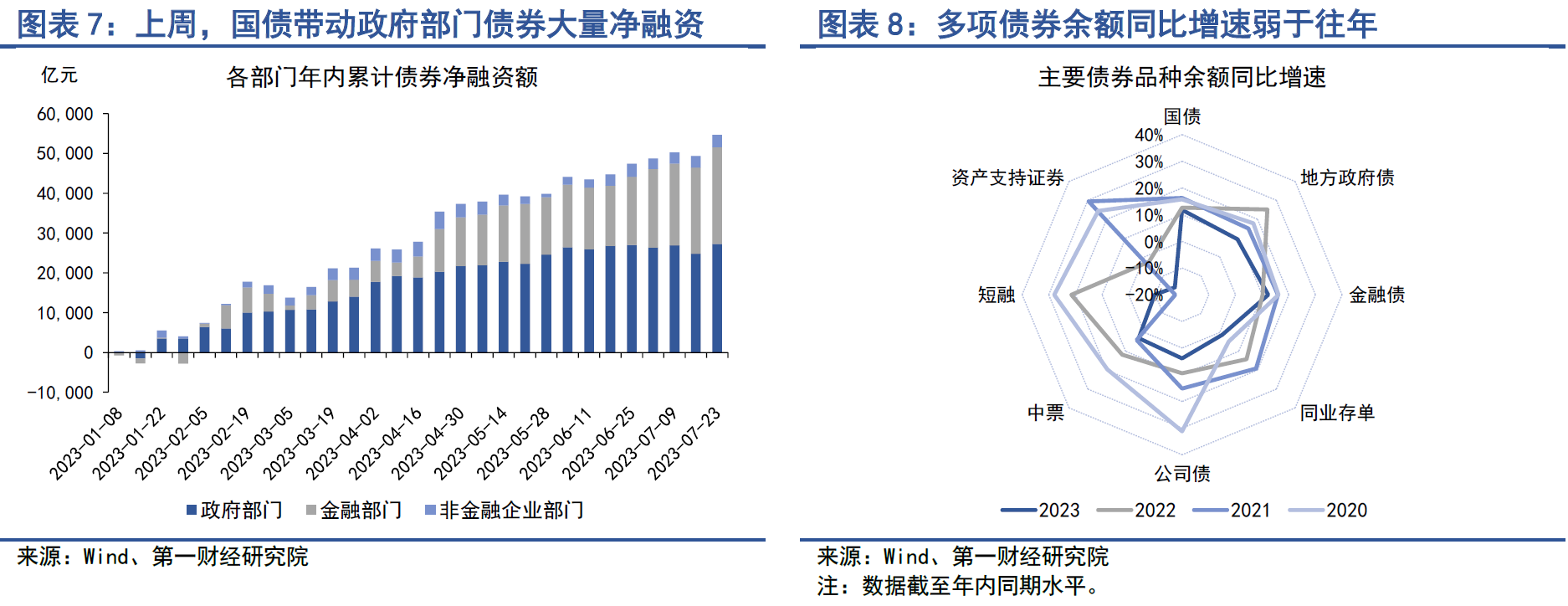 与往年同期相比,今年各类债券融资同比增速均呈现放缓的景象。截至7月23日,政府部门债券余额同比增速为10.3%,较2022年同期增速下降9.4个百分点;金融部门债券余额同比增速为8.9%,较2022年同期下降2.5个百分点;非金融企业部门债券余额同比增速降至-1.9%,较2022年同期增速下降9.7个百分点。