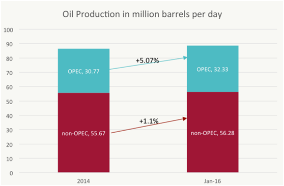 最近两年,石油产量显著增加。2015年,美国页岩油产量持续增长;伊朗石油出口解禁,重回石油国际市场;OPEC国家也没有进行减产计划。多重因素导致石油产量在2015年大幅增长。截至2016年1月,全球石油总产量已从每日的8600万桶增加至8850万桶,增幅约为3%。而国际能源署在最近发布的月度报告中称,未来全球将淹没在石油中。石油产量的增加对油价造成下行压力。