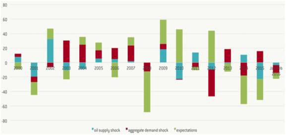 而引起石油价格变化的因素远不止这一个。石油供给的真实变化、石油需求的真实变化以及对石油未来供需平衡的预期变化都将致使油价变动。如图2所示,金融危机之后,预期变化的重要性显著提升,对油价的影响占据主导地位。这意味着仅依靠石油的供需量已不能很好地解释油价的大幅波动。