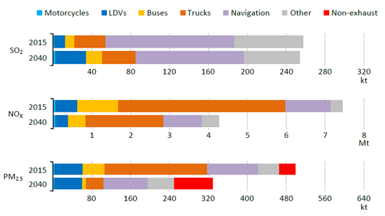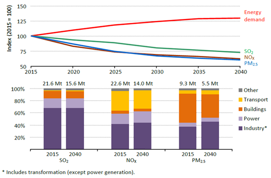 中国针对空气质量出台的强力政策已开始奏效。报告预测,在包含最新政策和COP21气候承诺的新政策情景下,中国的三大空气污染物(颗粒物PM2.5、SO2和NOX)排放会持续降低。