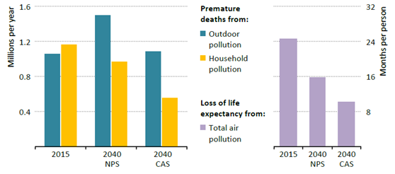 2015年,中国有约100万人由于室外空气污染过早死亡,约120万人由于室内空气污染过早死亡,空气质量差使中国人平均寿命缩短25个月(图6)。