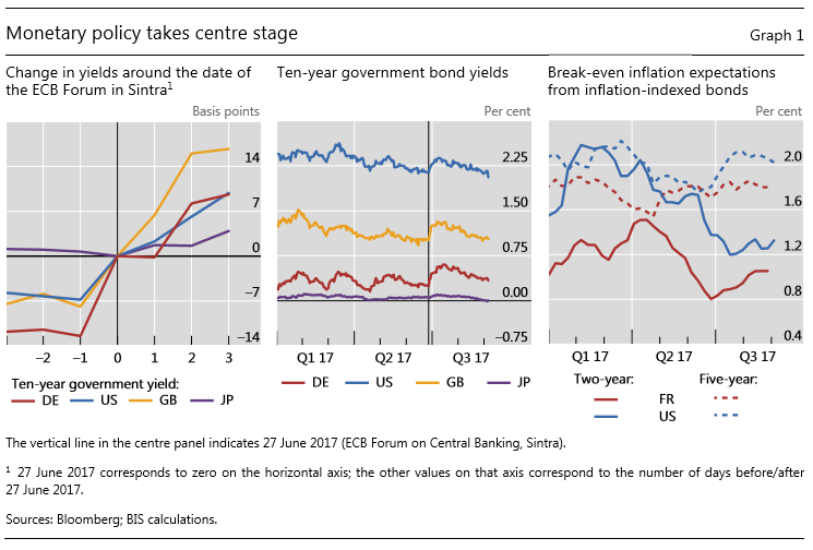 图1 货币政策成焦点(1:欧央行Sintra央行论坛前后十年期国债收益率 2:十年期国债收益率 3:通胀指数国债蕴含的平准通胀预期)
