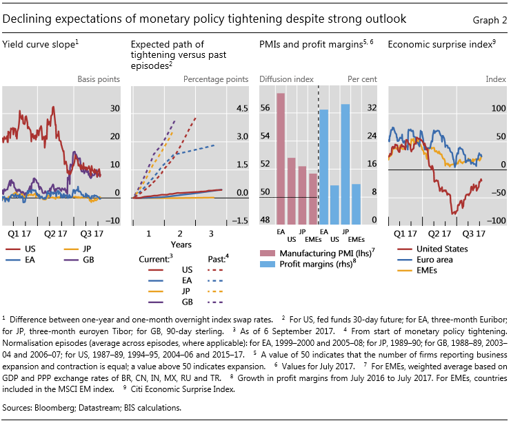与此同时,尽管发达经济体劳动力市场趋紧,但菲利普斯曲线却依然不见陡峭,工资上涨乏力,美国和欧元区7月核心通胀率仅为1.7%和1.3%,低通胀使得以通胀水平为锚的各国货币政策转向需要小心翼翼,市场预期核心国家将放慢收紧的步伐。美国财政刺激政策预期迟迟得不到兑现,欧元区和日本“偏鸽”的政策声明也都加强了这样的预期(图2-1、2、4)。