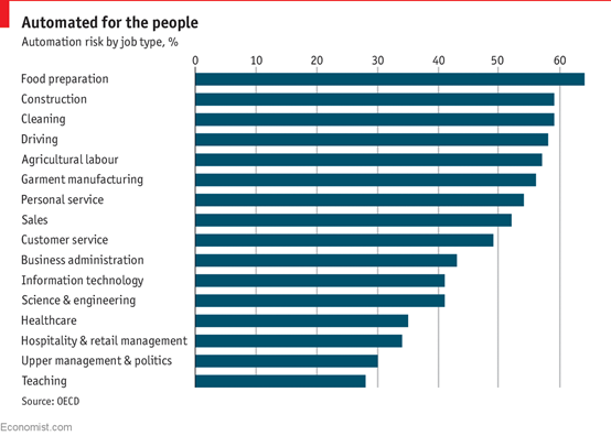 早在2013年,牛津大学的Frey和Osborne研究发现,未来一、二十年美国的702项工作中的47%将被机器所取代。OECD最新的一篇工作论文考察了其它发达国家,得出了类似的结论:32国中14%的工作非常脆弱(即至少有70%的可能自动化),另外32%的工作次之(即有50%-70%的可能自动化)。按照当前的就业率,32国中的2亿1000万个工作岗位将受到机器的威胁。