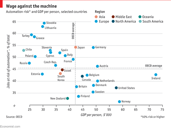 组织结构和产业融合方面的差异是原因所在,前者的作用更大。如韩国30%的工作在制造业,加拿大则是22%。但韩国的工作看来却更难自动化。这可能是由于韩国的雇主找到了更好的方法结合日常的工作和社交性、创造性的工作而不会降低生产率。这是计算机或机器人做不到的。还有一个更悲观的解释是“幸存者偏差”:韩国的工作难以自动化是因为他们已经把大部分容易自动化的工作交给了机器。