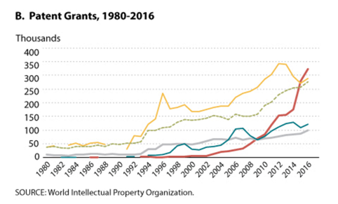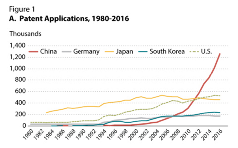 中国在专利申请数量方面已经超越美国和其他创新型国家,近年来在专利许可方面也处于领先地位。