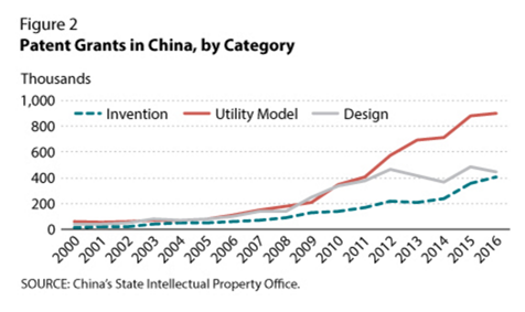 二是专利的类别。2000-2016年,中国专利许可中高质量的发明专利仅占19.3%,实用新型专利和设计专利分别则占到44.5%和36.2%。