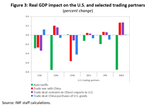 上述工作论文将多部门可计算一般均衡(CGE)贸易模型应用于165个国家,分别研究了三种情景下的潜在长期影响。第一种情景估计了潜在的美国汽车关税的影响,即美国对从所有贸易伙伴进口的汽车和零部件征税,且后者加征同等的关税予以反制。第二种情景分析了中美达成交易型的贸易协议,即中国购买更多美国农产品和飞机等产品,限制对美的制造业产品出口,从而消除双边贸易赤字。第三种情景考虑了中美两国之间双边关税可能升级,即中美互征25%的关税。总体而言,各国GDP受到的影响不大,但对于联系较密切的“旁观者”经济体而言,其部门受到的冲击以及溢出效应(正面或负面)可能会很大。