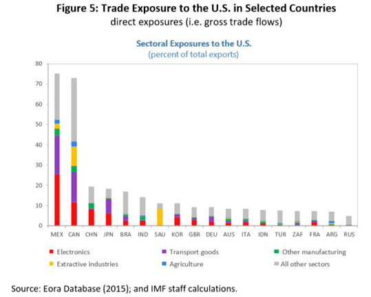 在三种情景下,美国GDP将下降0.2-0.3个百分点。其它国家在不同的情景下表现各异。中美互征关税的情景下,两国损失最大,而墨加是最大的受益方。同样在情景一中,墨加也是损失最大的国家(图4)。这是由于该两国和美国的贸易联系十分密切(图5)。