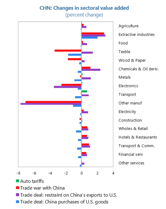 长期来看,有管理的贸易协议将引发全球性生产部门和生产率的混乱。C. Caceres等人的工作论文《贸易战和贸易谈判:使用多部门模型估计的影响》研究发现,如果通过中国增加购买美国商品来实现中美双边贸易赤字减少50%,美国的一些部门将从中获益,中国的这些部门则将面临困难。此外,越南、澳大利亚的采掘业,韩国、马来西亚的电子产品部门都将受到严重影响。而且这种再分配对生产率的长期影响是负面的。若考虑调整成本以及劳动力和资本积累对贸易协议可能引发的新扭曲的动态反应,总损失可能更大。