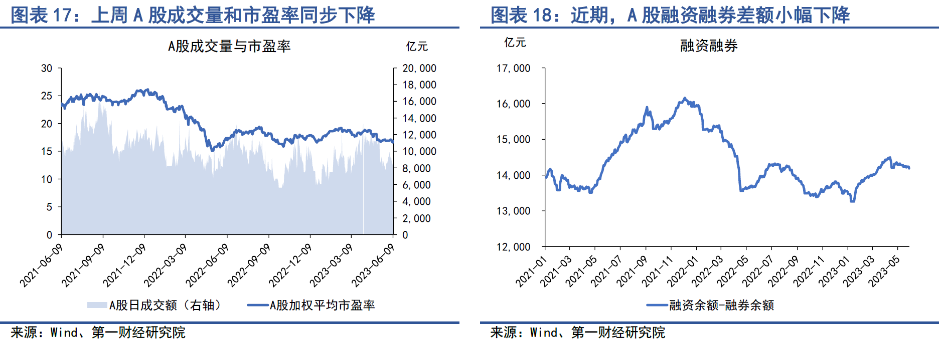 上周,A股成交量与市盈率再度双双下降。从成交量来看,上周A股日均成交量回落至8981亿元,较前一周下降5.1%;从市盈率来看,上周A股加权平均市盈率降至16.8,已回落至去年年底的水平。A股融资与融券的差额下降至1.42万亿元左右。
