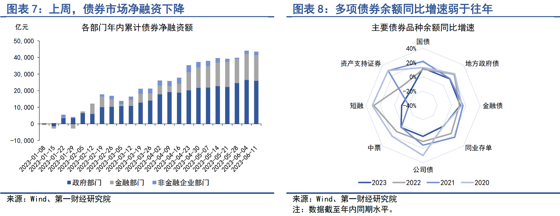 从年内来看,政府部门占债券市场净融资的比重依然高达近60%,金融部门为35.7%,而非金融企业部门仅为4.7%。截至6月11日的一周,政府部门债券余额同比增速为12.6%,较2022年同期增速下降4.3个百分点;金融部门债券余额同比增速为8.6%,较2022年同期下降3.7个百分点;非金融企业部门债券余额同比增速降至-1.7%,较2022年同期增速下降10.9个百分点。