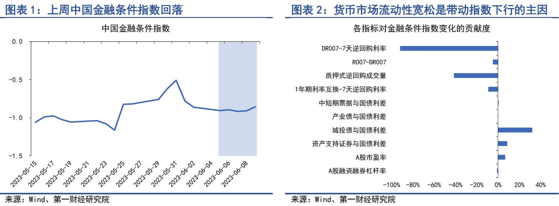 在6月5日至9日当周,第一财经研究院中国金融条件日度指数均值为-0.9,较前一周下降0.19,年内指数下降0.86。从指数的成分指标来看,上周指数下行主要由货币市场流动性宽松所带动。从货币市场来看,上周隔夜回购利率与7天回购利率下降幅度在15bp至19bp区间,市场流动性保持充裕。从债券市场来看,城投债与国债利差以及资产支持证券与国债利差较前一周有所上升。从股票市场来看,A股市盈率下滑明显,风险偏好回落。