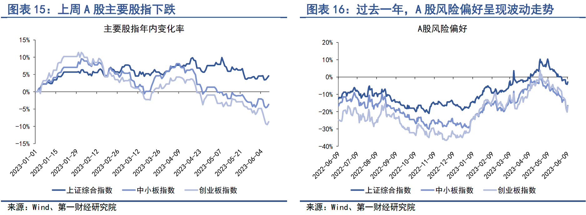 在A股主要股指中,上周上证综指上涨0.1%,中小板指下跌1.6%,创业板指下跌4.1%。从过去一年的表现来看,主要股指风险溢价(股指同比变化减去10年期国债收益率)呈现M形走势,截至6月9日,上证综指、中小板指以及创业板指风险溢价的年内累计上升幅度分别达到14.57%、12.33%和15.25%。