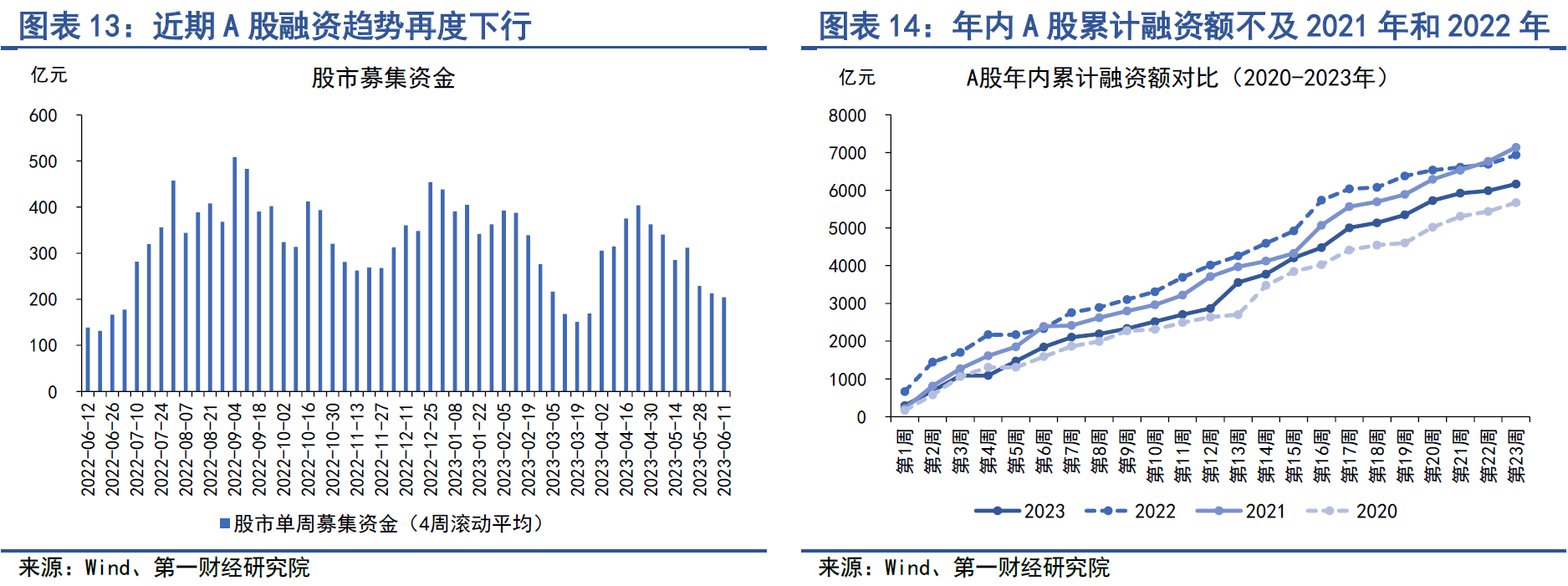 上周,A股融资总额为176.26亿元,较前一周上升109.74亿元。从A股融资4周滚动平均的数据来看,自4月下旬起,A股融资再度呈现下降趋势。截至6月11日,A股年内累计募集资金6163.06亿元,低于2021年和2022年同期水平。