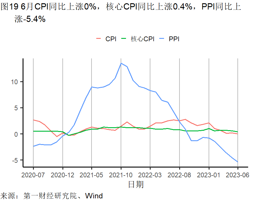 国家统计局公布了6月CPI和PPI数据。6月,同比来看,CPI维持水平不变。具体看,食品CPI当月同比增长2.3%,增速较上月加快1.3个百分点,推动了CPI增长;非食品CPI增速则自2021年3月以来首次进入同比负增长区间,当月同比下降了0.6%。其中,6月,核心CPI同比增长0.4%,增速较上月放缓了0.2个百分点。能源价格指数的走低是拖累当月CPI增长的主要原因。具体指标中,食品方面,鲜菜价格当月同比增速由上月-1.7%上升至10.8%;鲜果增速也较上月加快了3.0个百分点至6.4%,这两项均拉动了食品价格的增长。猪肉价格则同比继续下降,降幅较上月扩大了4.0个百分点。非食品方面,6月,交通工具用燃料价格同比下降17.6%,降幅较上月扩大了6.5个百分点,是当月非食品价格同比增速放缓的重要原因。