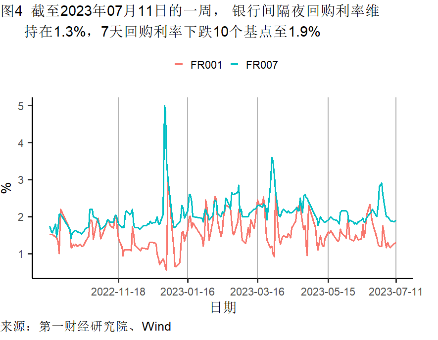 截至7月11日的一周,央行通过公开市场净回笼资金为5070亿元。银行间隔夜利率在截至7月11日的一周维持水平不变,过去一个月下降7个基点,较去年同期上升4个基点。七天回购利率在过去一周下降10个基点,过去一个月上升5个基点,较去年同期上升30个基点。