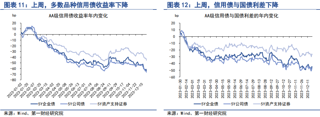 上周,信用债收益率普遍下降。在AAA级债券中,5年期企业债、公司债以及资产支持证券收益率分别下降5.33bp、5.34bp和5.11bp。在AA级债券中,5年期企业债、公司债和资产支持证券收益率分别下降7.22bp、5.89bp和6.11bp。