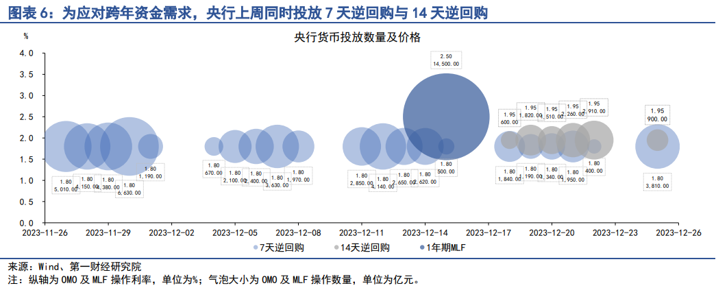 上周,为了应对跨年资金需求,央行同时投放7天逆回购与14天逆回购,拉长资金期限。上周,央行共投放7天逆回购6720亿元,投放14天逆回购9100亿元,回笼资金1.28万亿元,净投放资金3060亿元。