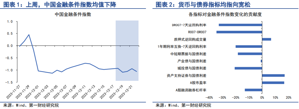 在12月18日至12月22日当周,第一财经研究院中国金融条件日度指数均值为-1.02,较前一周下降0.17,年内指数下降1.0。从指数的成分指标来看,上周货币与债券指标均指向宽松。从货币市场来看,上周主要货币利率下降,银行间市场流动性保持充裕。从债券市场来看,利率债与信用债收益率同步下降,信用利差收窄。从股市来看,上周A股市盈率创下2013年以来新低,成为少数示意金融条件紧缩的指标之一。