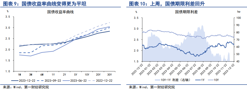 上周,国债收益率曲线整体下移。从短端来看,受银行间市场流动性较为充裕影响,短端国债收益率下降幅度明显,其中1月期、3月期、6月期以及1年期国债收益率分别下降16.36bp、13.3bp、13.2bp以及6.53bp。从中长端来看,11月经济数据显示实体经济复苏力度偏弱,以房地产和A股为代表的资产价格处于下行周期,市场整体风险偏好下降带动中长端国债收益率走低,其中2年期、5年期、10年期以及30年期国债收益率分别下降4.77bp、3.02bp、2.65bp和5.03bp。
